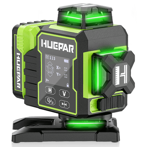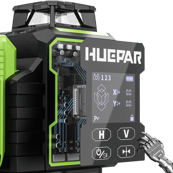 Le niveau laser Huepar W04CG est équipé d’un écran LCD haute définition, garantissant une visibilité claire des paramètres essentiels, même dans des environnements faiblement éclairés. L’écran fournit des informations en temps réel, telles que :